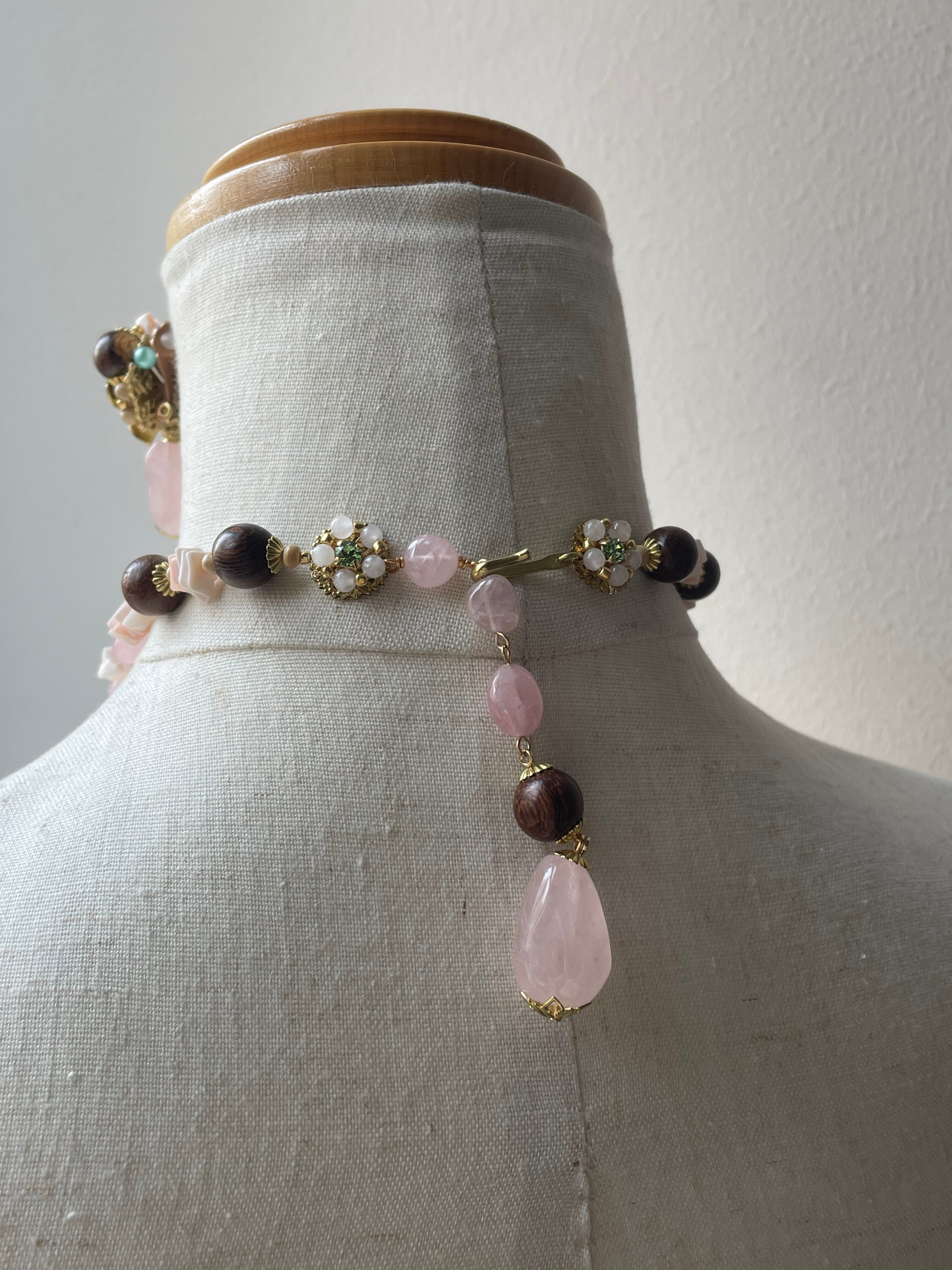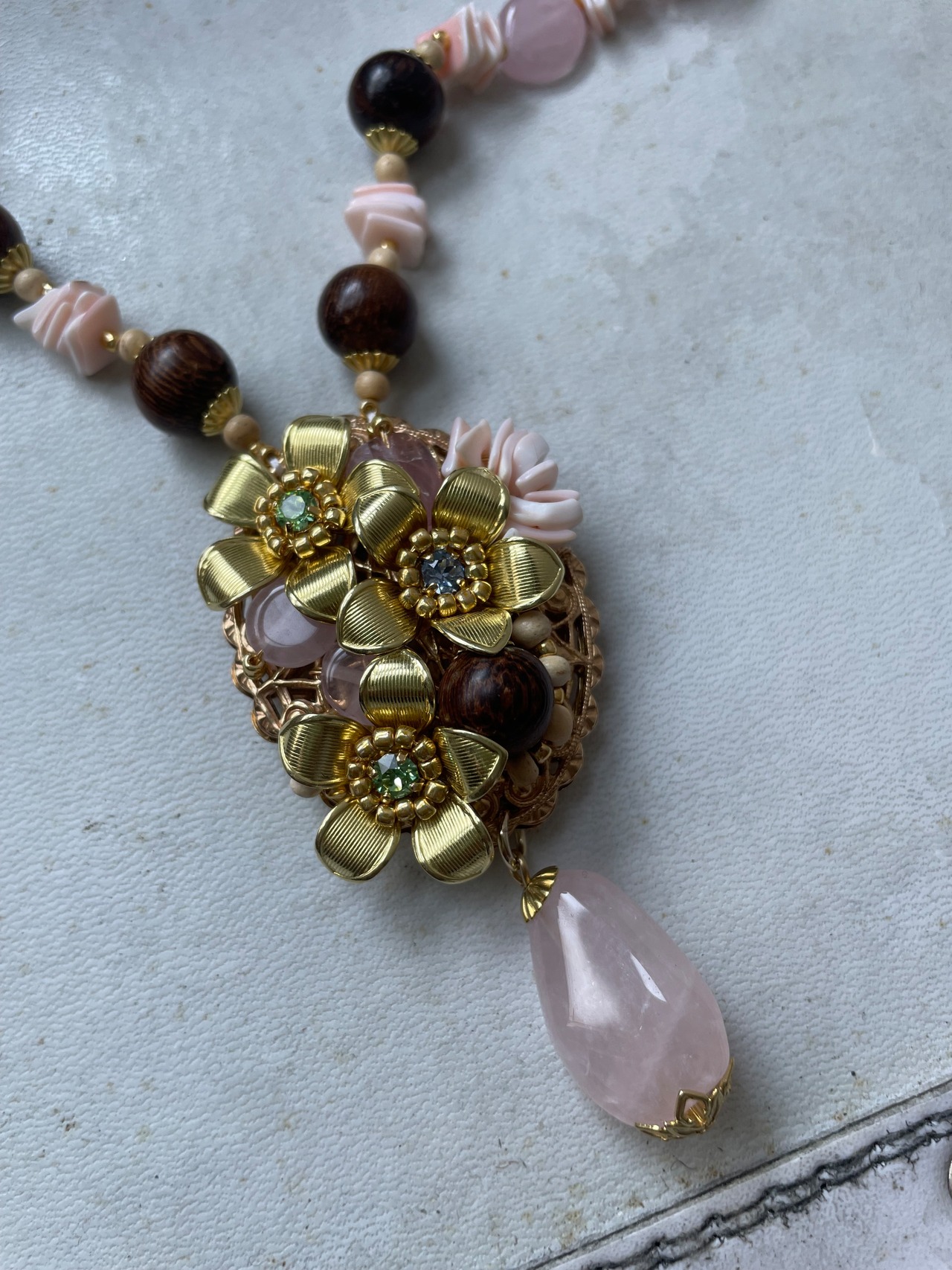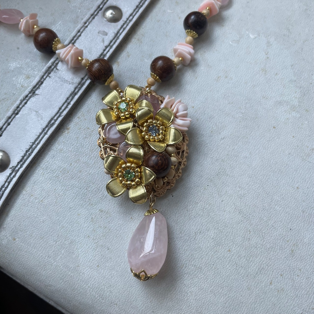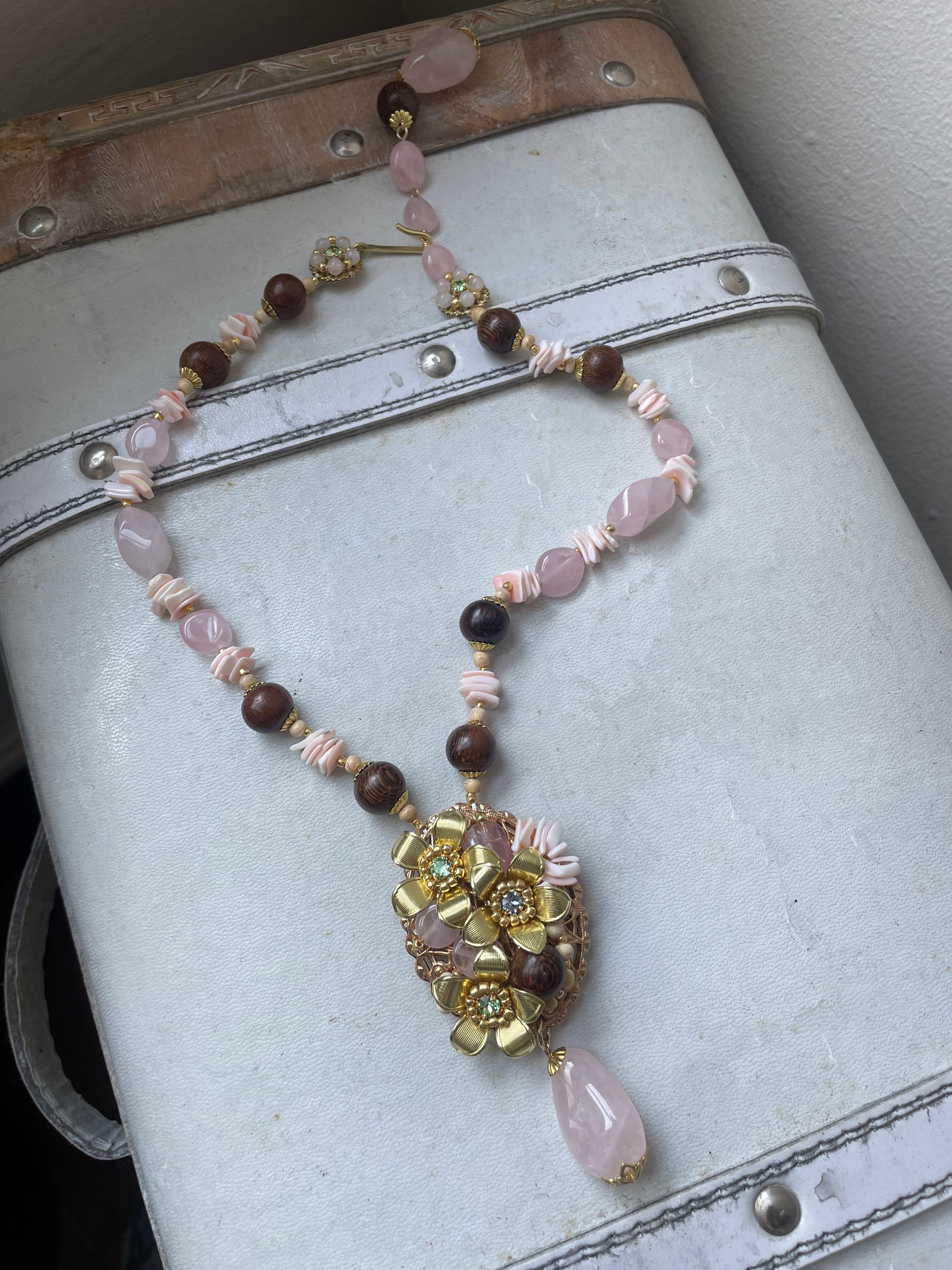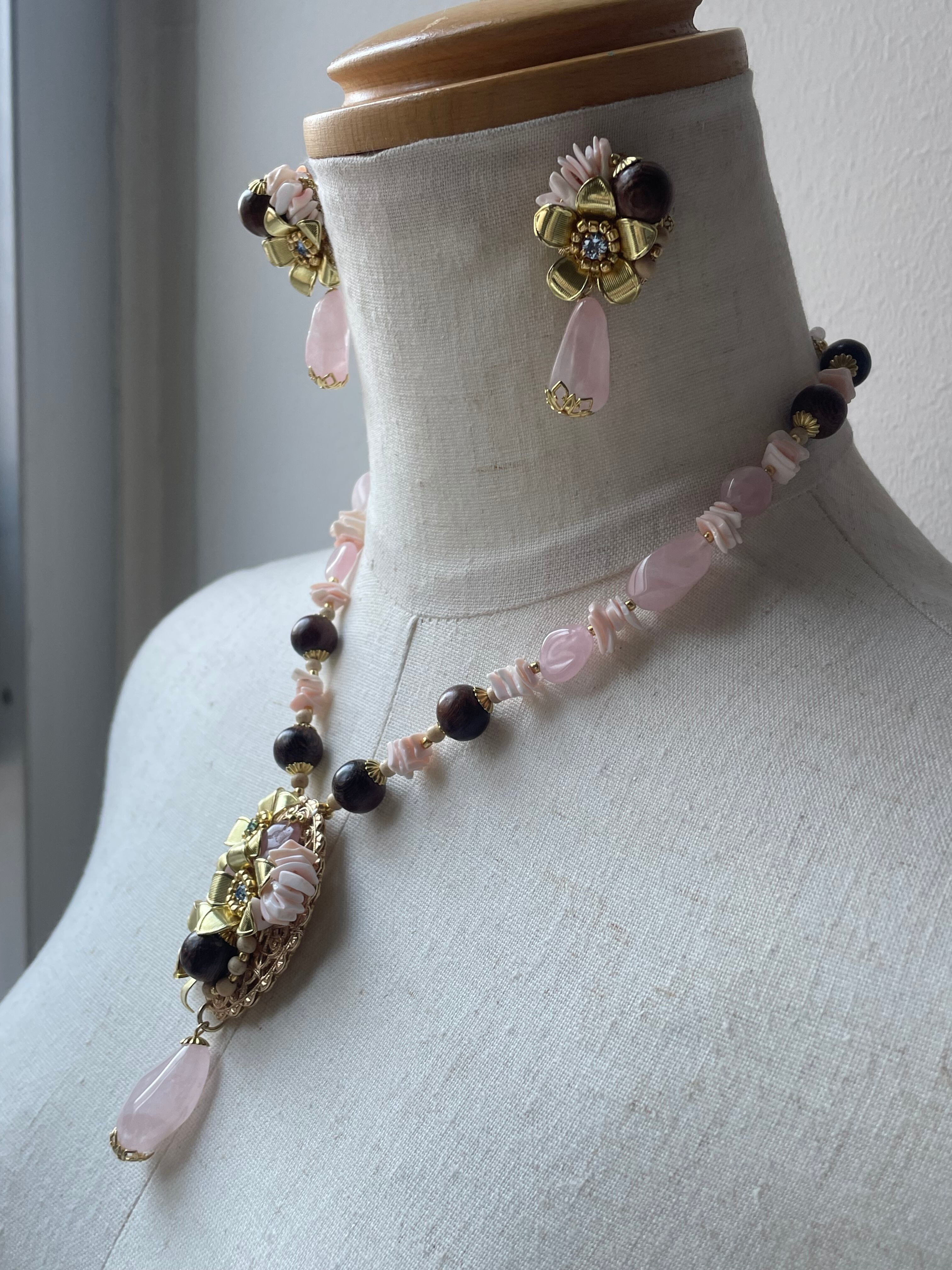 ウッドビーズ、淡水貝のビーズ、ローズクォーツ、
