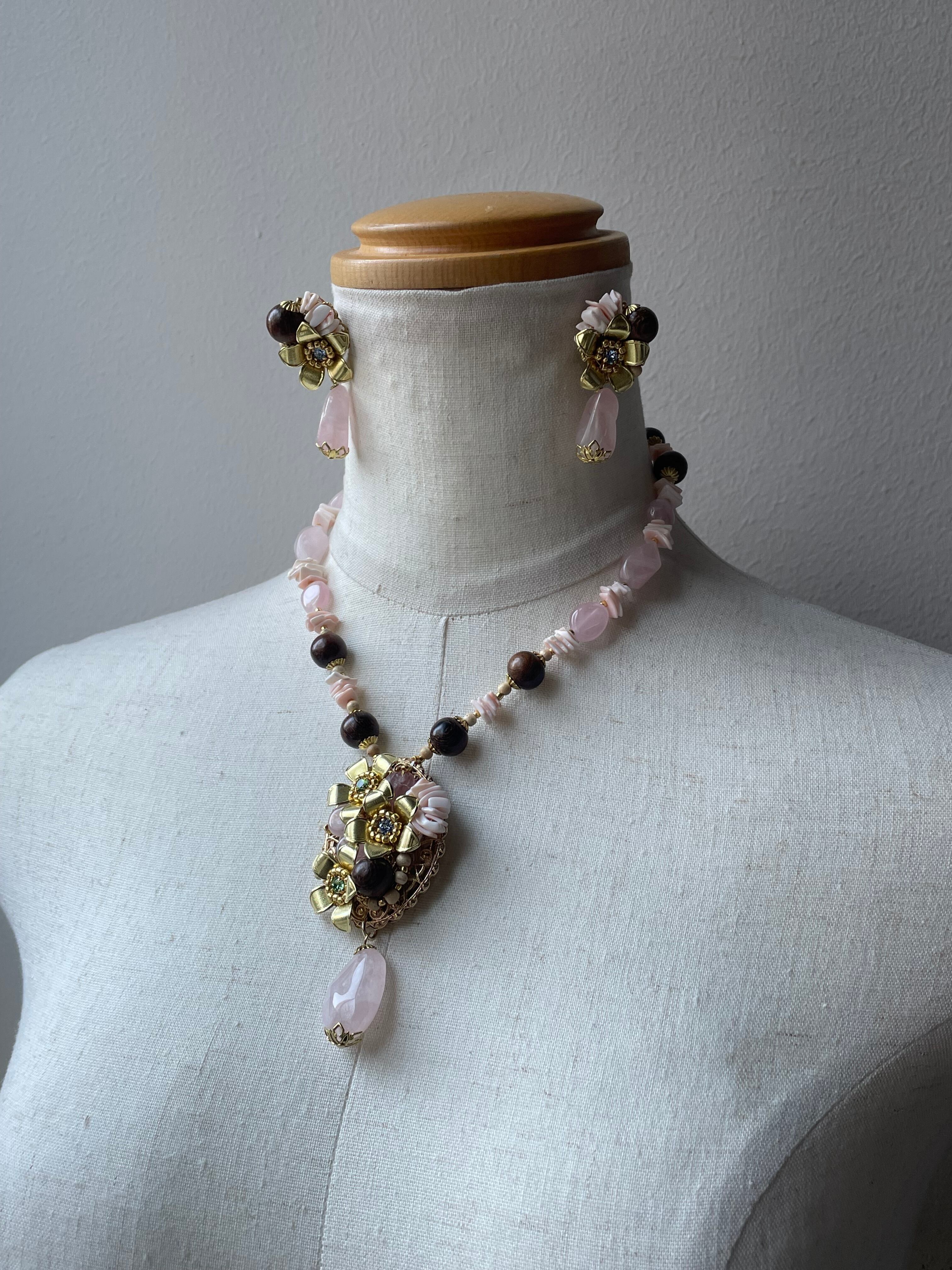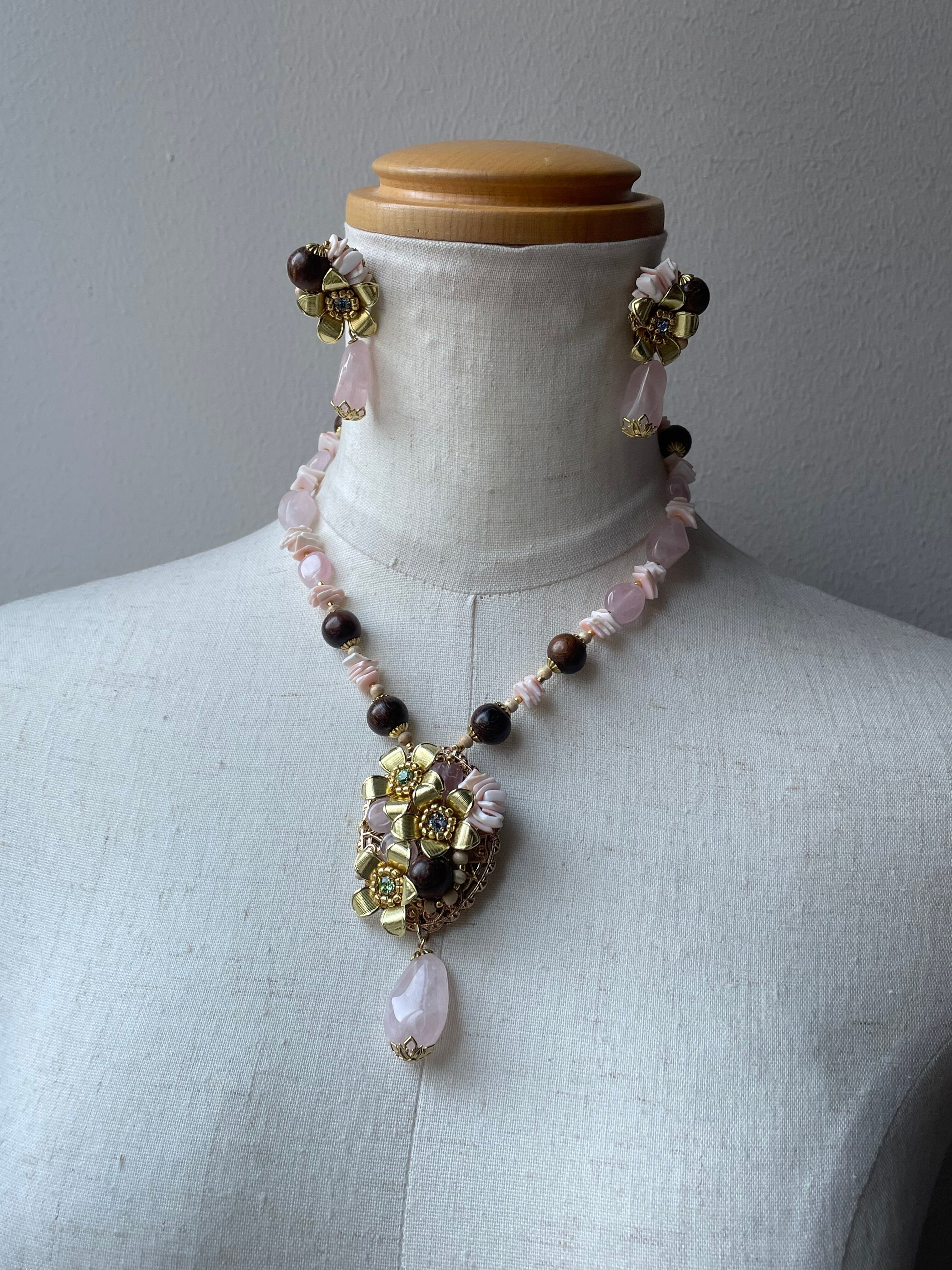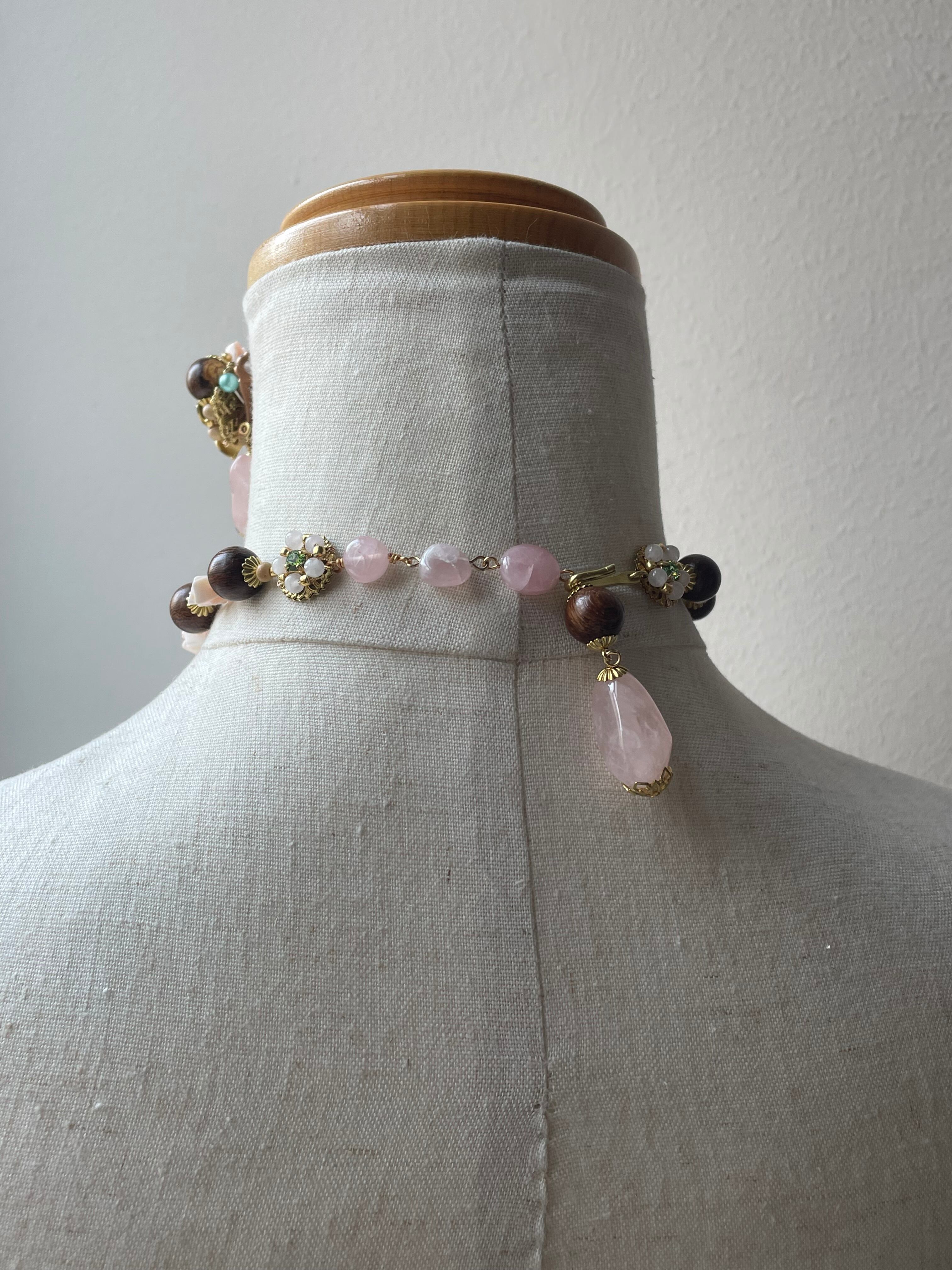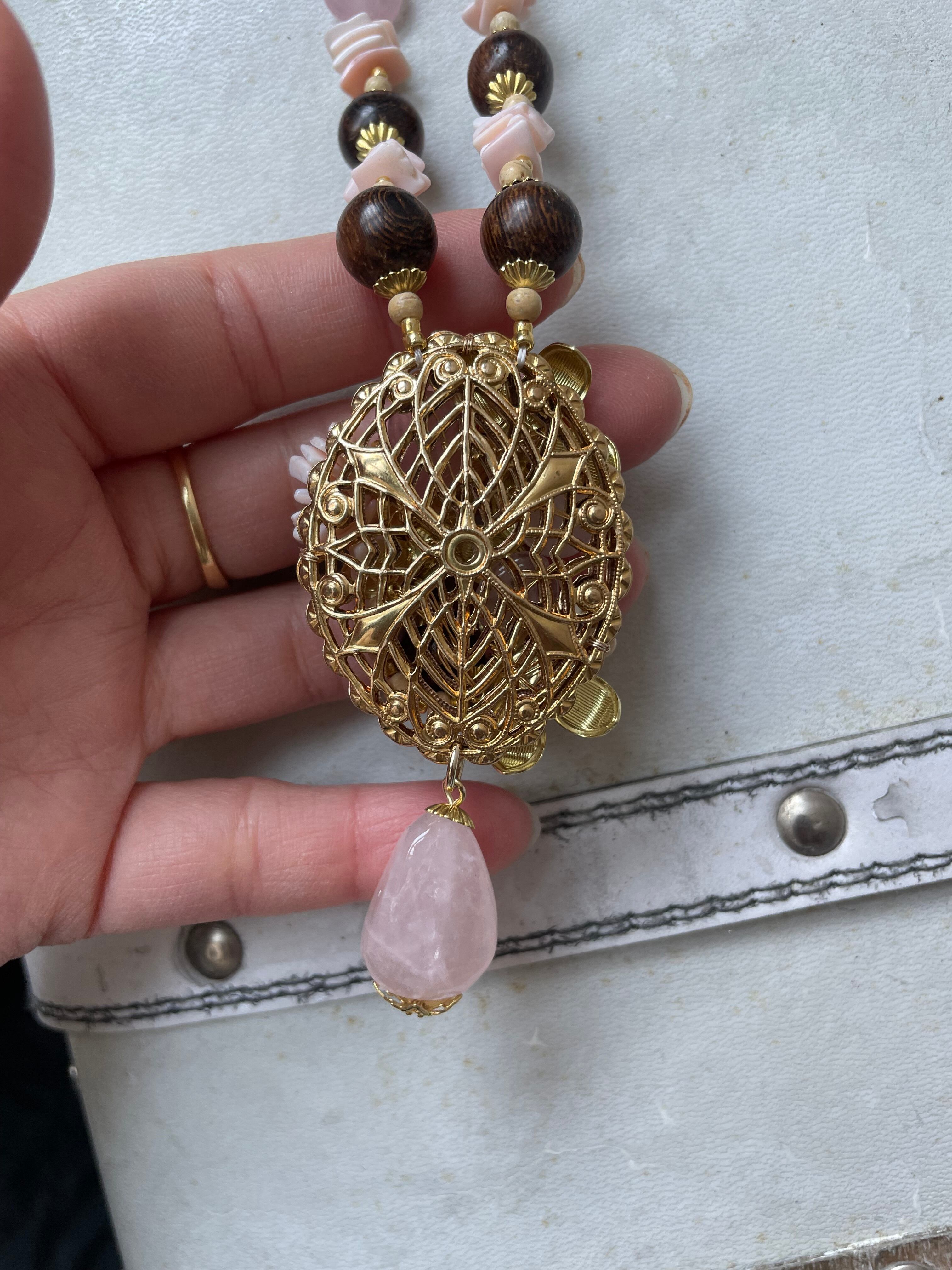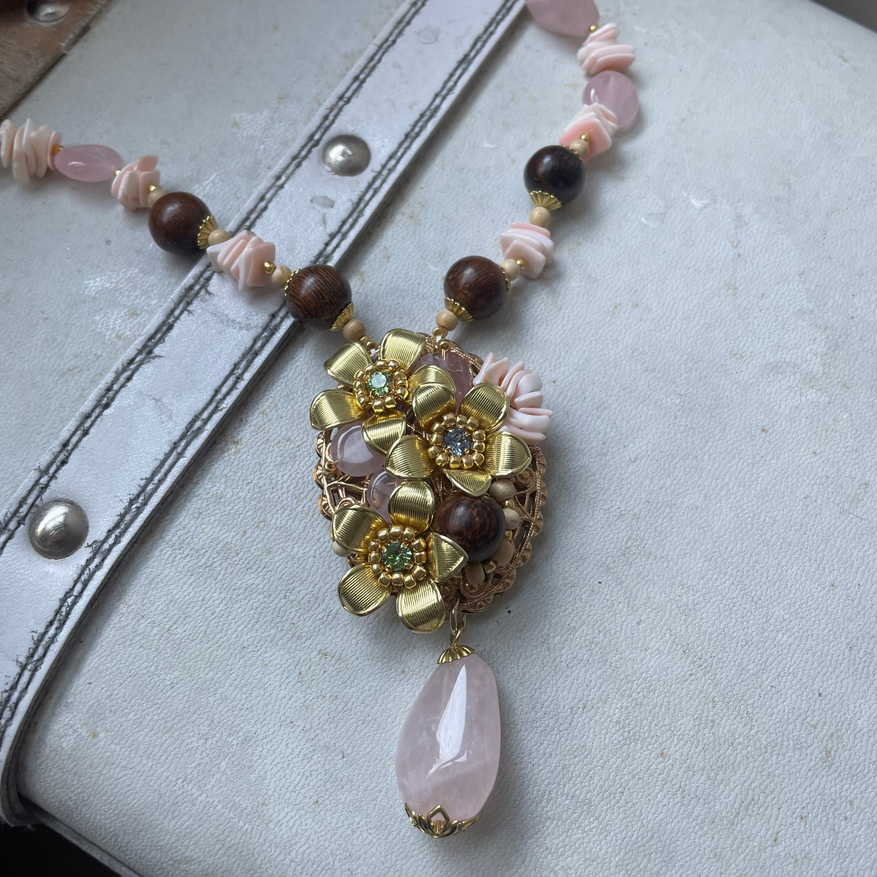 ウッドビーズ、淡水貝のビーズ、ローズクォーツ、
