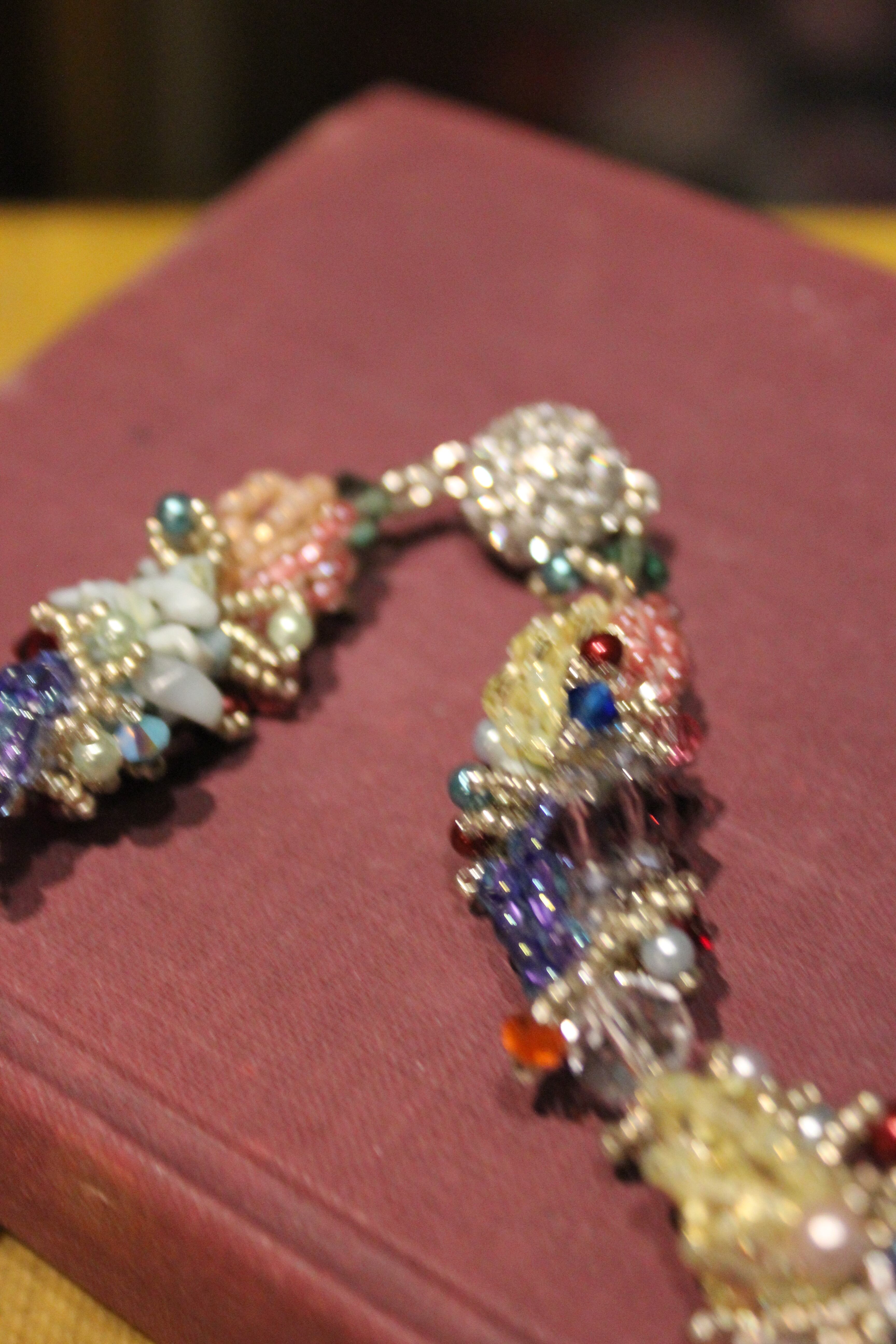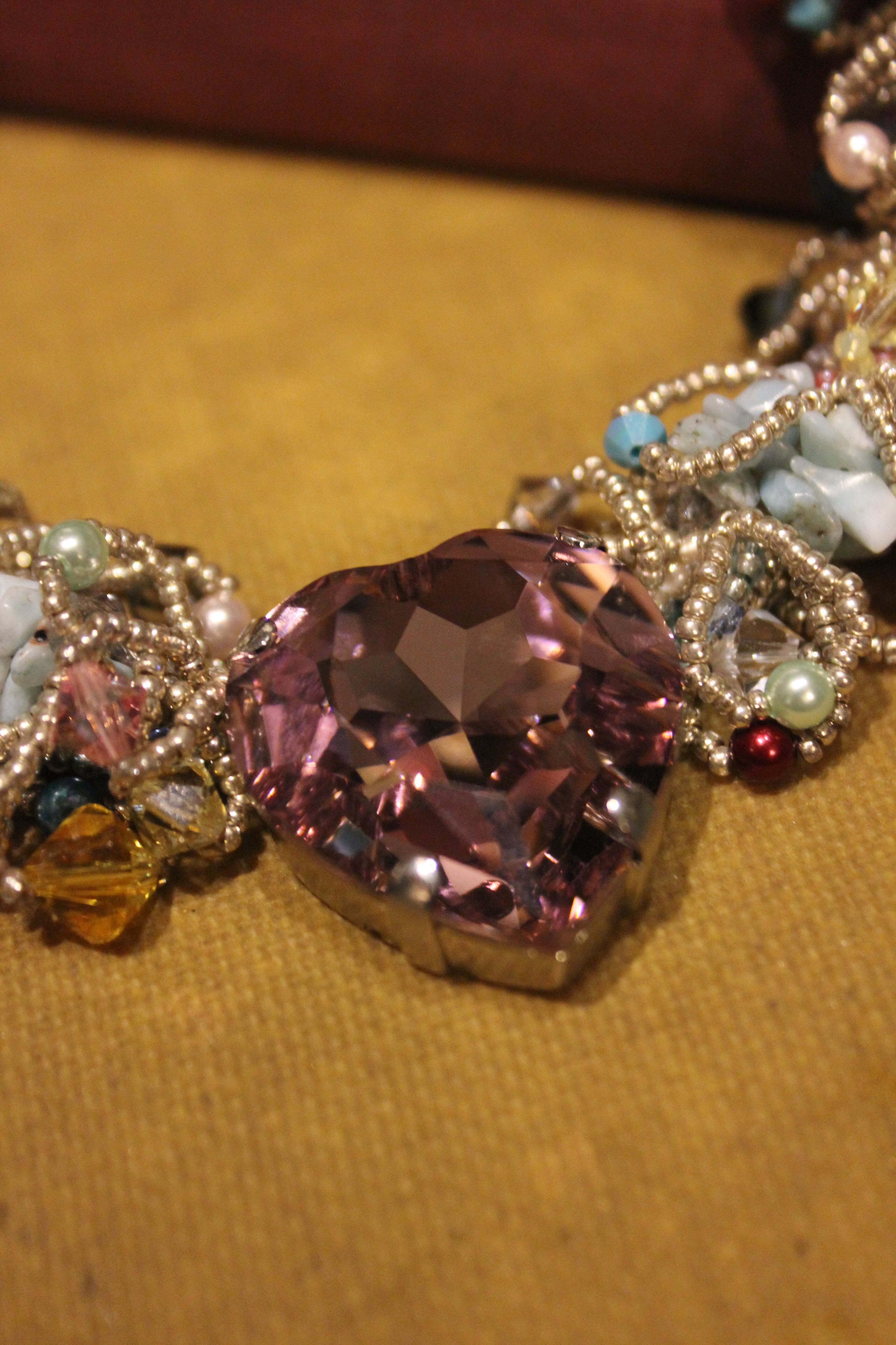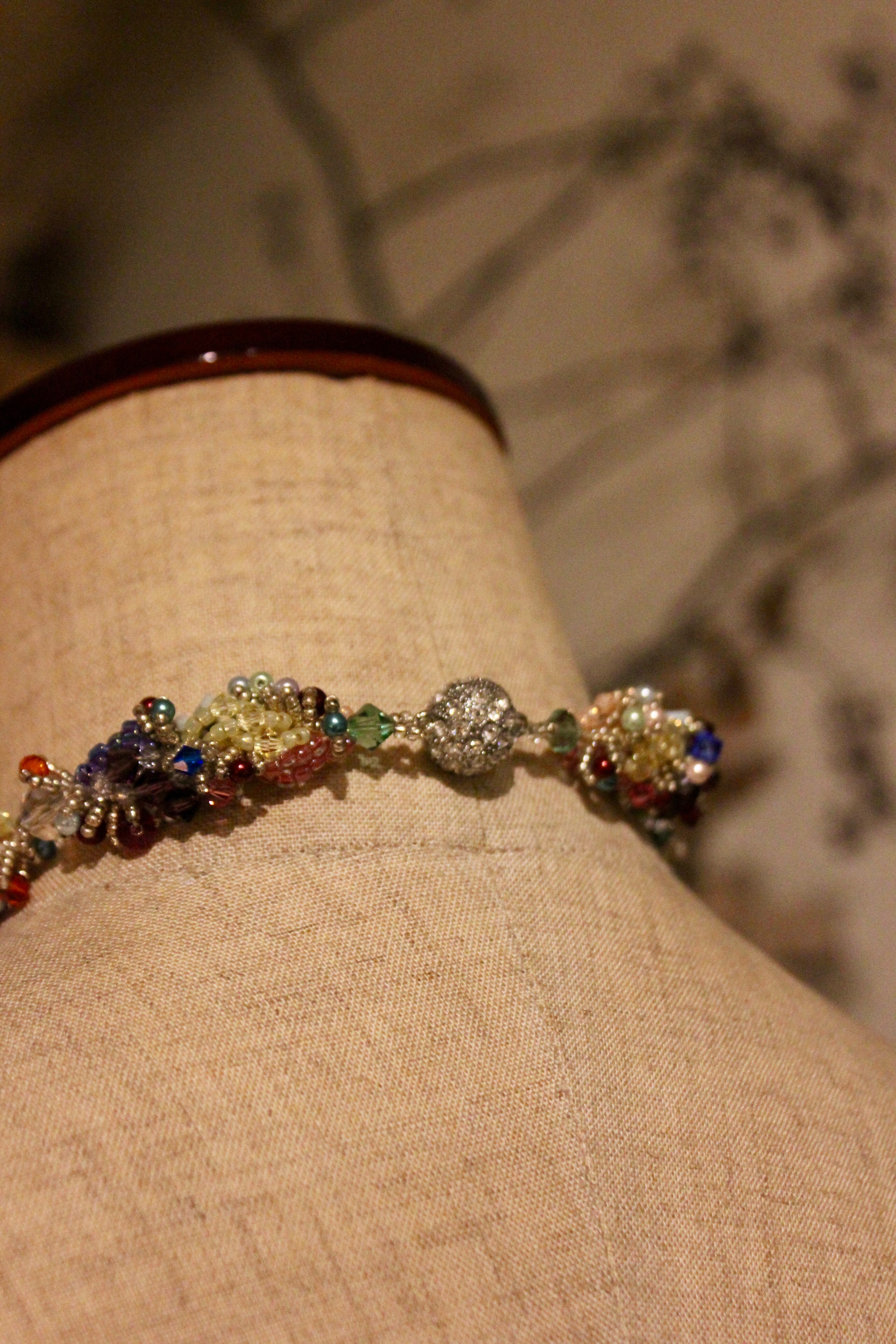 たくさん色を使うと加色混合で色のトーンは下がりますので、実際身につけていただくと派手すぎることはありません。スワロを使っていますのでキラキラ光りますが、