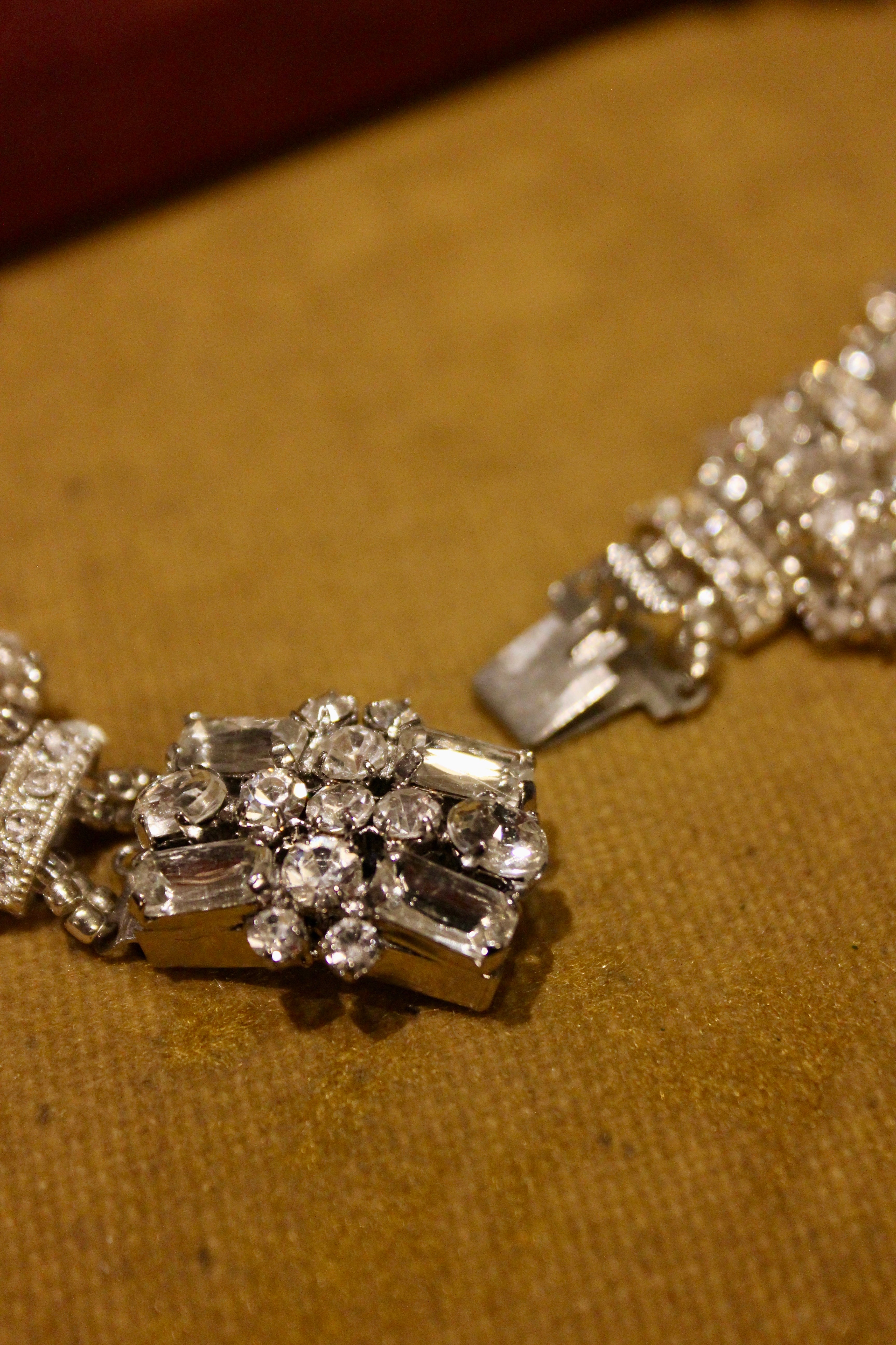 つけ襟風のデザインで可愛らしく、留め具を斜めの位置にしていただければクールでアシンメトリーなデザインに。小さなスワロ同等のクリスタルガラスもたくさん仕込みましたので見た目以上に、キラキラと光り夜のお出かけにはぴったりです。