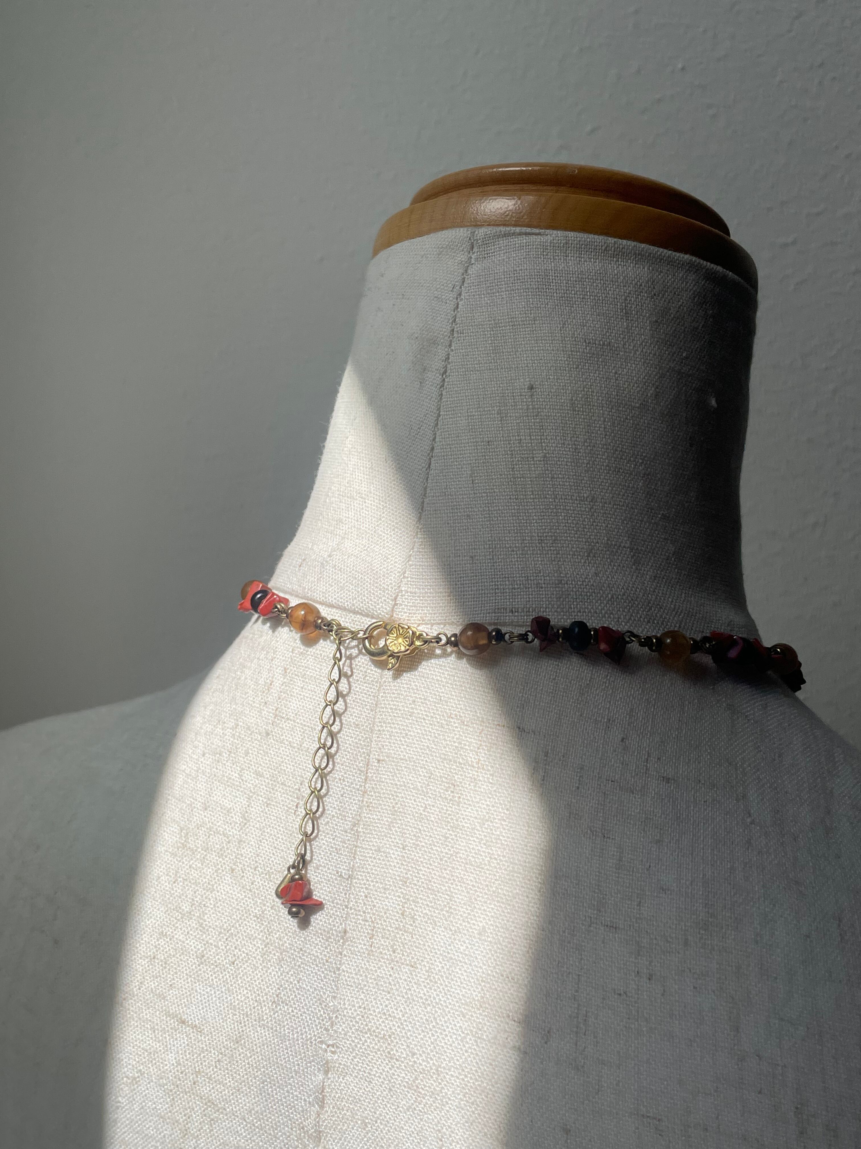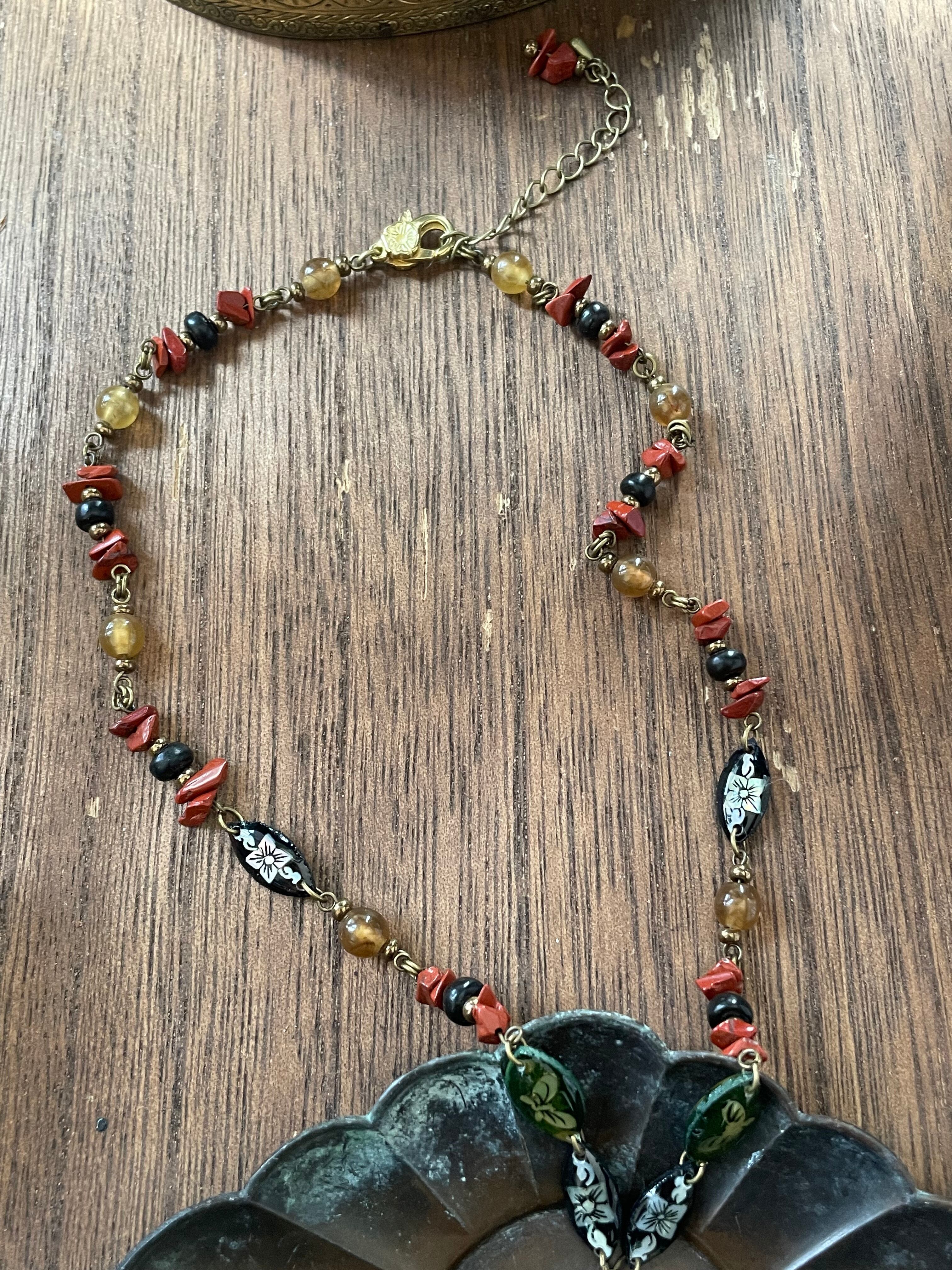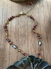 今回、赤の天然石(ジャスパー)黒、ブラウン、クリーム色のビーズは水牛のツノのビーズ