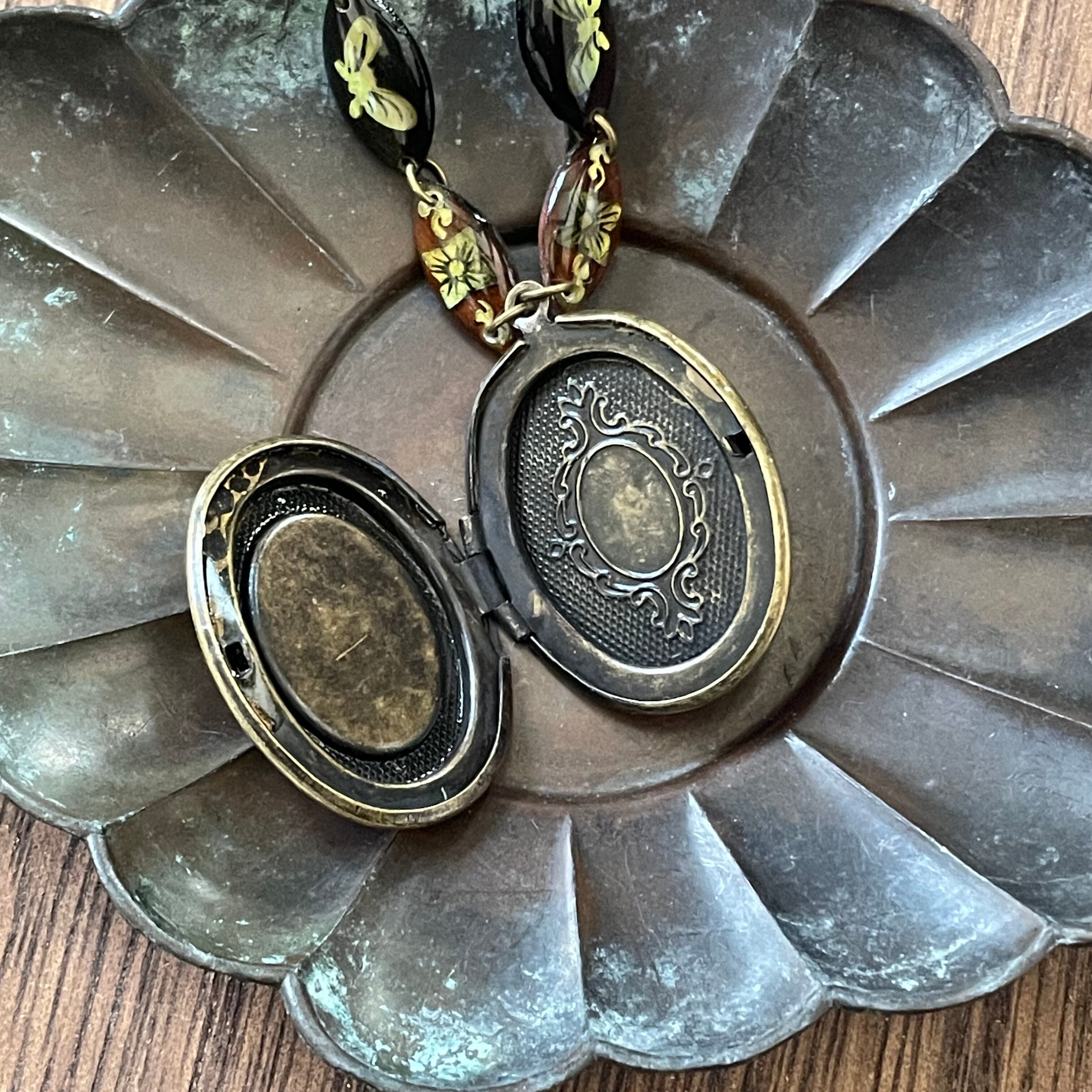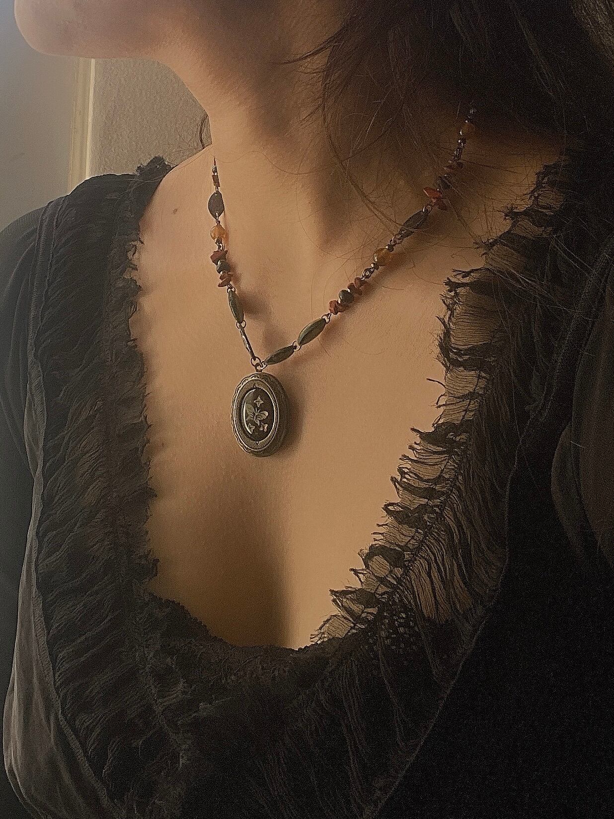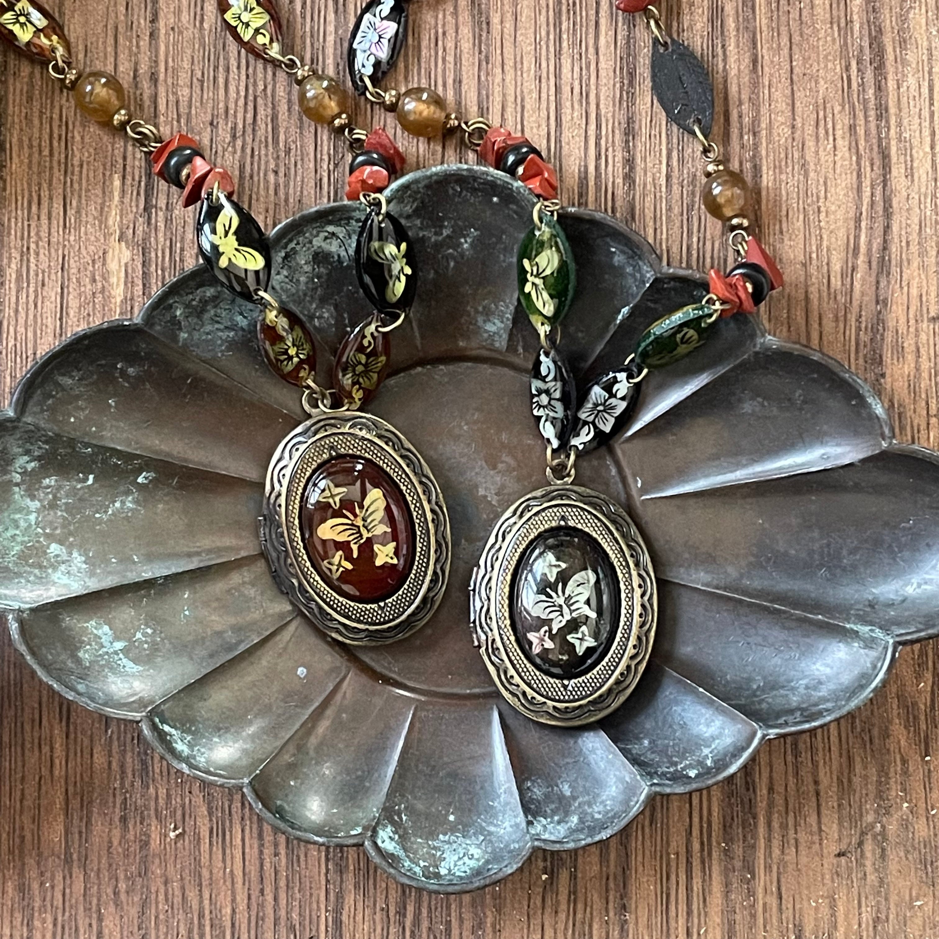 シャネルも愛した螺鈿を思わせるオリエンタルな貝細工のカボションを見つけましたのでそれをロケットに嵌めてみました。パールとの相性も良さそうなので、重ね付けも試してみてくださいね。今回のシリーズの1連のチョーカーと重ねても相性◎ですよ!
